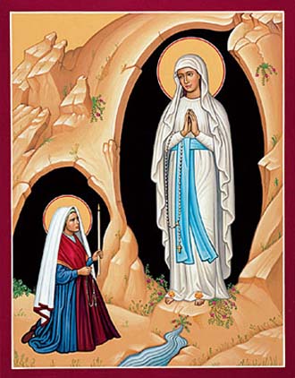 Istintivamente, Bernadette s'inginocchiò, tirando fuori la coroncina del Rosario. La Signora la lasciò fare, unendosi alla sua preghiera con lo scorrere silenzioso fra le sue dita dei grani del Rosario. Alla fine di ogni posta, recitava ad alta voce insieme a Bernadette il Gloria Patri. Quando la piccola veggente ebbe terminato il Rosario, la bella Signora scomparve all’improvviso, ritirandosi nella nicchia, così come era venuta.